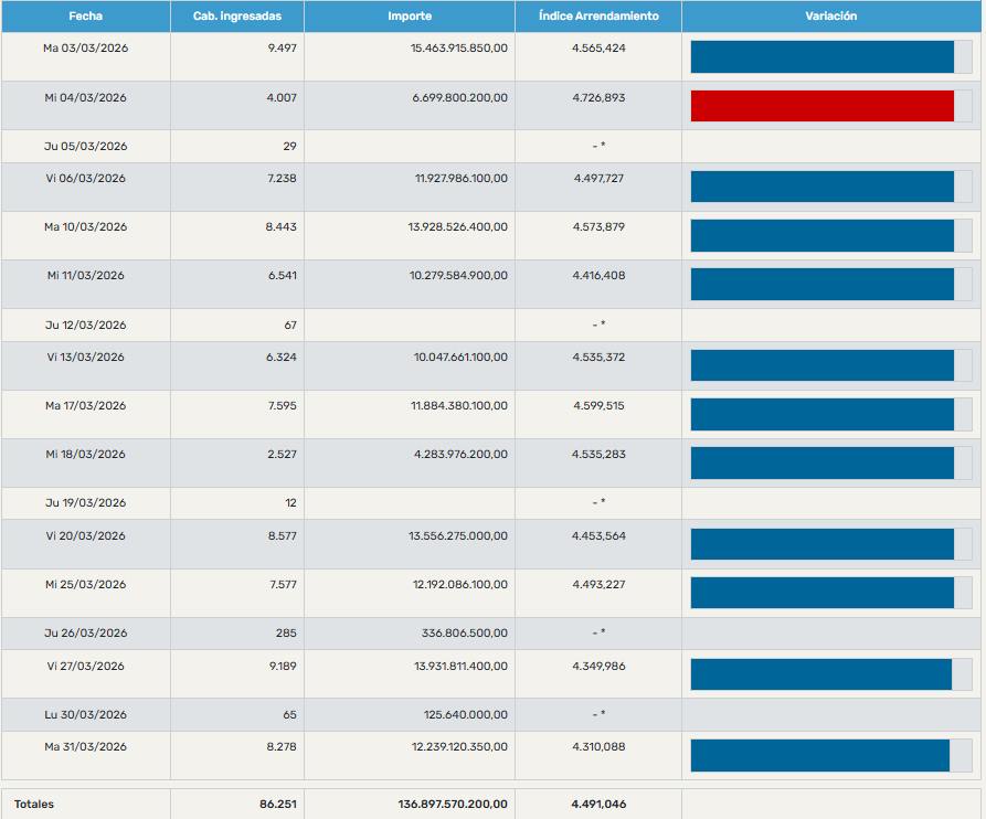 En los contratos con actualización mensual, el dato a considerar es el índice consolidado del período completo. Para Marzo de 2026, este se ubicó en 4.491,046, en comparación con los 4.520,462 registrados durante febrero pasado.