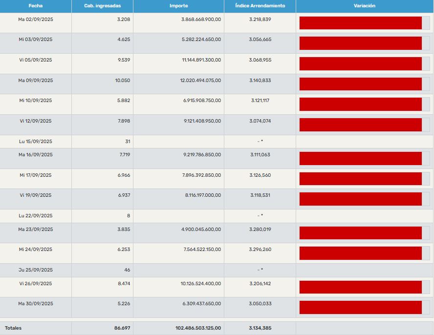 Para aquellos contratos con ajustes o vencimientos en los últimos días del mes, los datos correspondientes a la cuarta semana de Septiembre han sido oficializados. El índice de arrendamiento rural se estableció en 3.251,923.